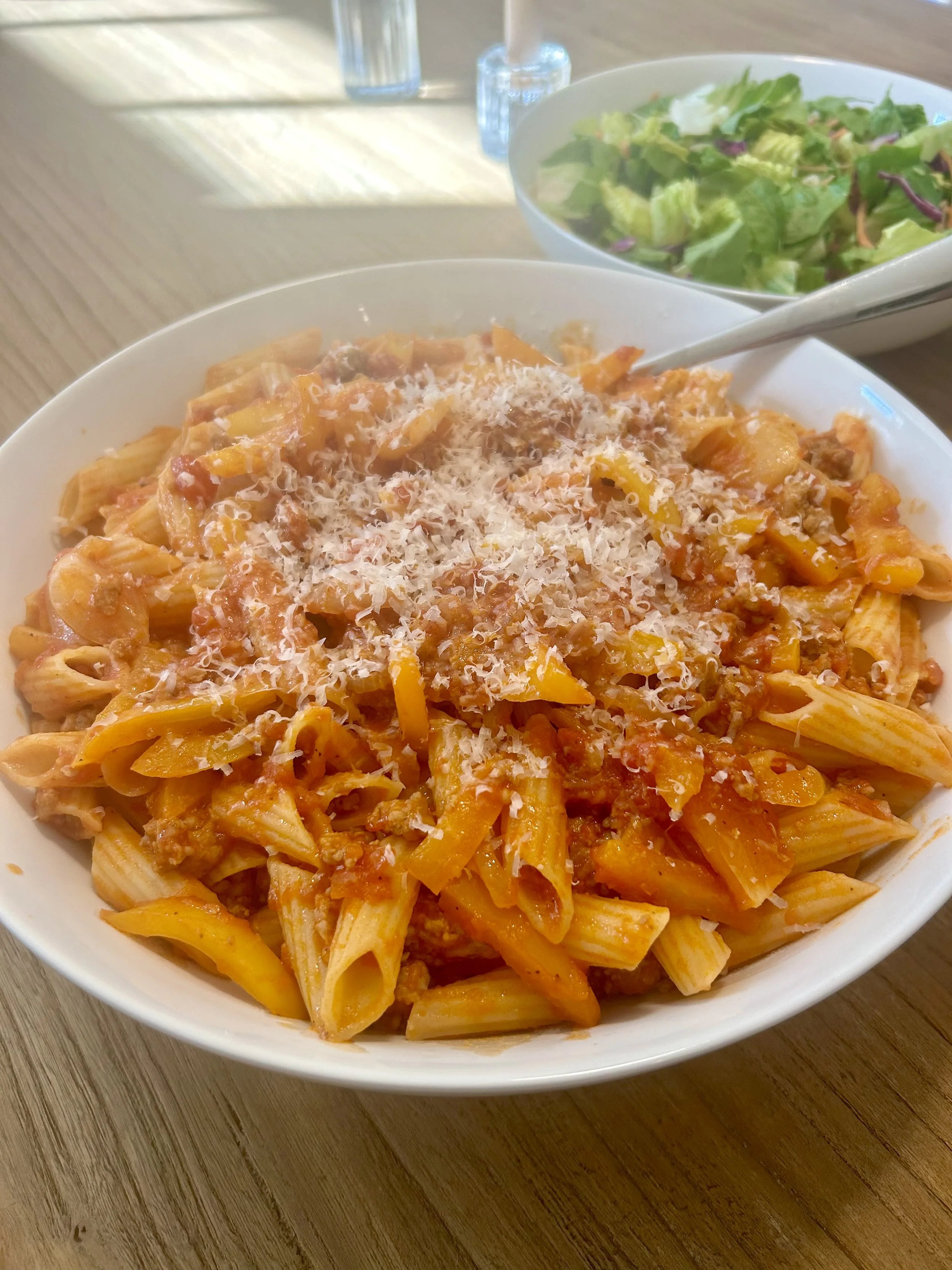 While water comes to a boil slice bell peppers and onion to approximately the same size of your pasta noodles.